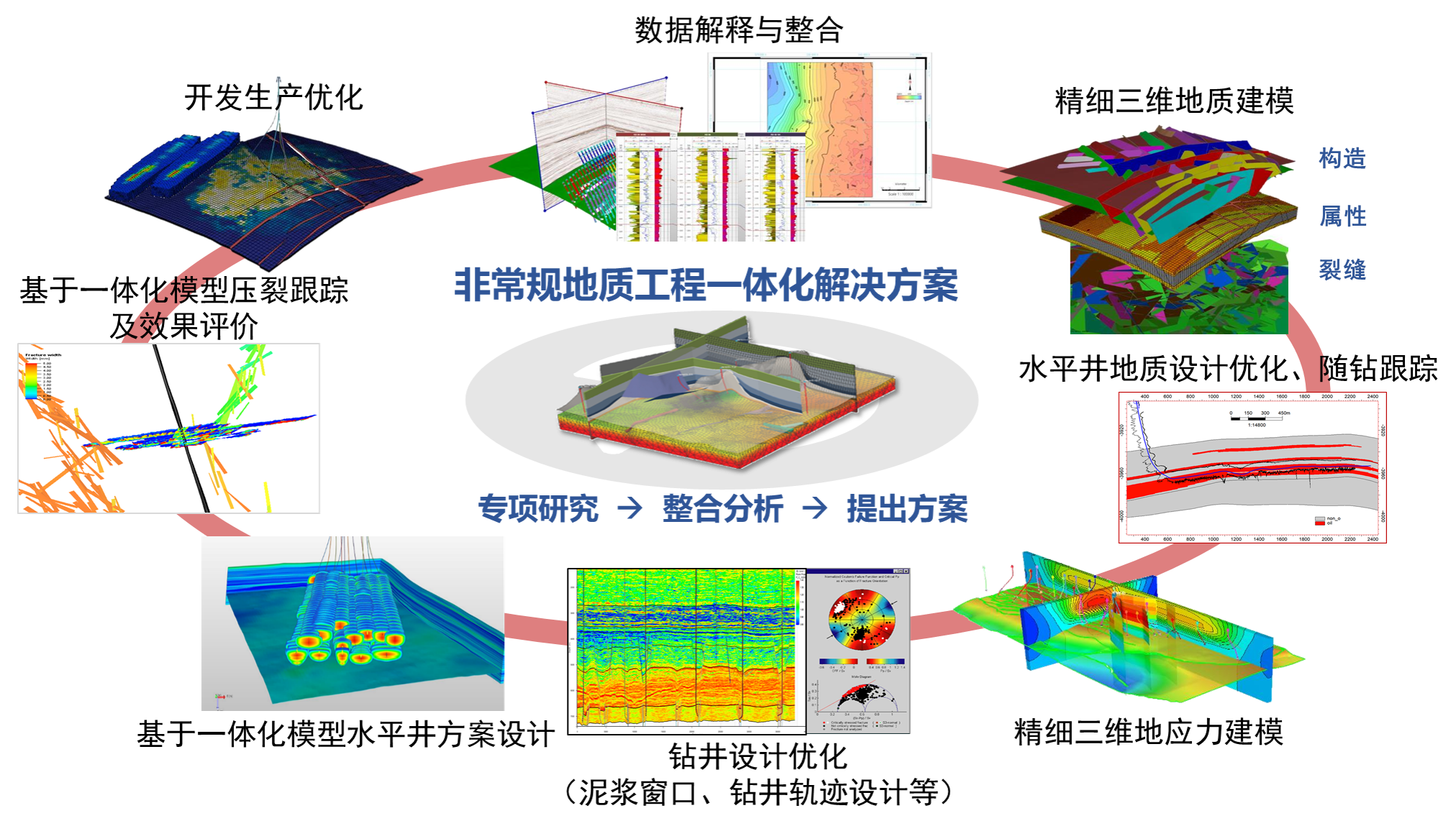 領先的頁巖油氣、致密油氣研究能力和一體化服務經驗,主要服務能力包括:1)基于井震結合的水平井隨鉆跟蹤技術,在三維地質模型的基礎上完成地質設計、隨鉆跟蹤調控及精細三維模型多次迭代調整。2)基于一體化模型鉆井安全設計技術,在單井地應力及三維地質模型基礎上建立三維巖石力學模型及地層可鉆性模型,預測新鉆井不同坍塌壓力、地層壓力等。3)基于一體化模型壓裂服務技術,在地質、裂縫、地質力學建模技術基礎上開展壓前地質風險預判及水平井方案優(yōu)化、壓中實時分析與優(yōu)化、壓后分析與總結。